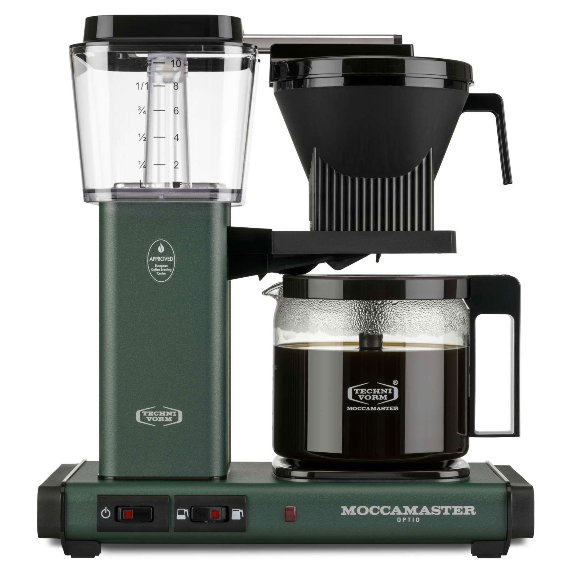 Unikt för Optio-modellen är att du via knappen till höger enkelt kan välja mellan att brygga en halv eller en hel kanna. Funktionen anpassar då bryggprocessen efter vattenmängden och temperaturen på värmeplattan, vilket ger det färdiga kaffet rikare arom och fylligare karaktär. Bryggaren har dessutom automatisk avstängning efter 40 minuter, för att kaffet inte ska brännas.