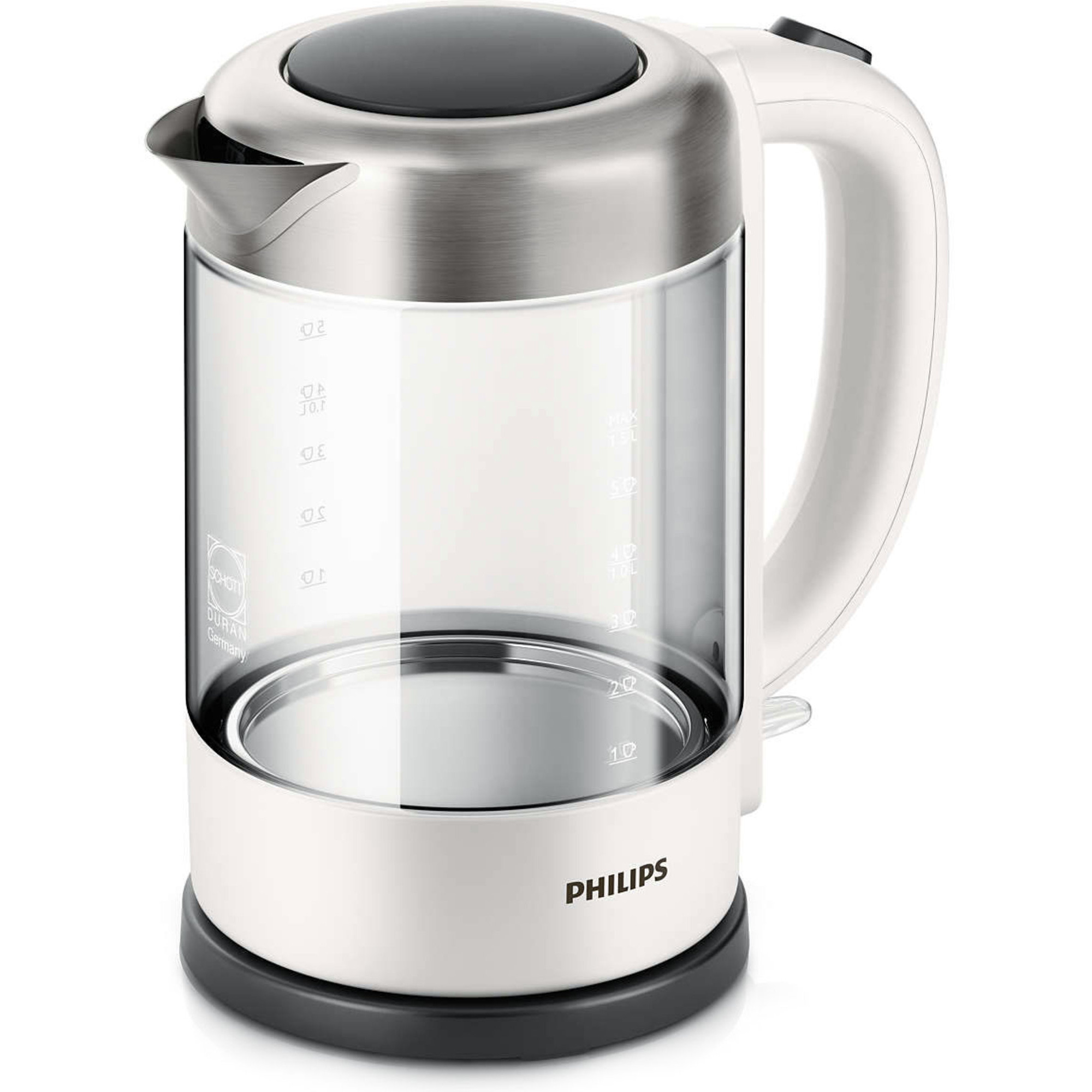 Elegant vattenkokare med kanna i glas och detaljer i rostfritt stål. Philips tillverkar robusta vattenkokare, och denna HD9340/00 är inget undantag. Kannan rymmer generösa 1.5 liter, och det inbyggda värmeelementet på 2200 watt värmer snabbt upp vattnet.- 360 graders basenhet som gör det enkelt att lyfta och placera kannan från alla håll.- Vattennivåindikator, som visar kopp för kopp.- Kannan i glas är enkel att rengöra.